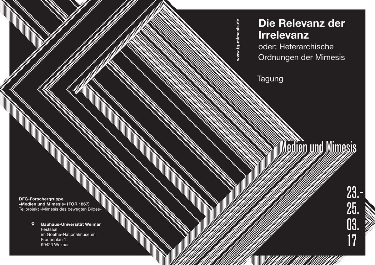 Vom 23. - 25. März 2017 richtet das Teilprojekt »Mimesis des bewegten Bildes« der DFG-Forschergruppe »Medien und Mimesis (FOR 1867)« seine Abschlusstagung »Die Relevanz der Irrelevanz oder: Heterarchische Ordnungen der Mimesis« im Festsaal des Goethe Nationalmuseums in Weimar aus. Die Tagung bildet den Abschluss der ersten Förderperiode des Teilprojekts und seiner Auseinandersetzung mit mimetischen Konzepten und ihren Dynamiken in bewegtbildlichen Kontexten.