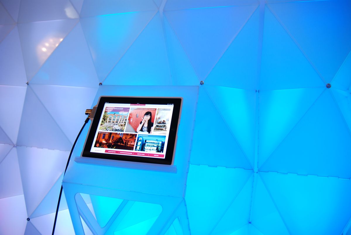 Im Messestand installierte iPads ermöglichen den Besucherinnen und Besuchern ergänzend zu den Broschüren und den umfangreichen Informationen auf der Website vielfältige Eindrücke zum weit gespannten thematischen Forschungs- und Lehrfeld an der Bauhaus-Universität Weimar. Zahlreiche Studienprojekte werden auf den iPads in deutscher sowie englischer Sprache und mithilfe von Fotos anschaulich vorgestellt. Während der Benutzung verändert sich ganz individuell die Farbgebung des gesamten Standes, je nach Anwahl der Inhalte.
