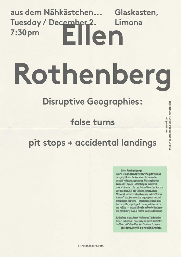 Ellen Rothenberg's work is concerned with the politics of everyday life and the formation of communities through collaborative practices. Working between Berlin and Chicago, Rothenberg is a member of the sci-fi feminist collective, Future Force Geo Speculators and since 2010 The Chicago Torture Justice Memorial. Recent collaborations also include “Chelen Amenca,” a project traversing language and cultural constructions. Her work - architecturally scaled installations, public projects, performance, collaborations, and writing - uncover histories embedded in the present particularly those of women, labor, and feminism.