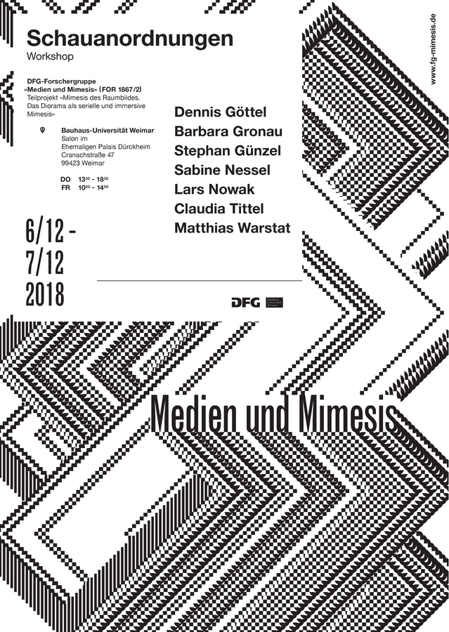 Das Teilprojekt »Mimesis des Raumbildes« der DFG-Forschergruppe »Medien und Mimesis« (FOR 1867/2) lädt am 6. Und 7. Dezember 2018 zu Ihrer Veranstaltung im Salon des ehemaligen Palais Dürckheim ein. Die Beiträge widmen sich den materiellen Operationen, Produktionsvoraussetzungen und vielfach verschlungenen Verdinglichungs- sowie Subjektivierungseffekten von Schauanordnungen.