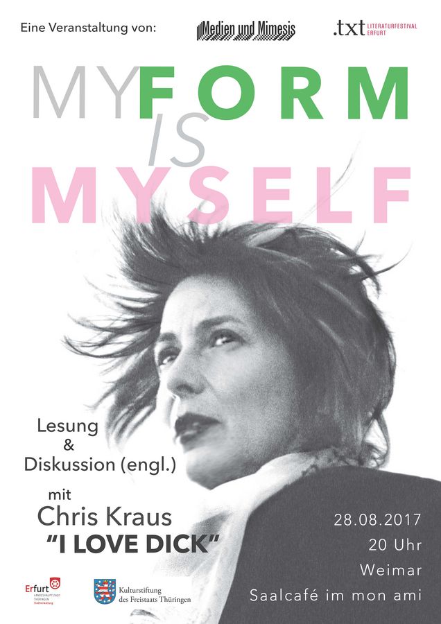 Im Rahmen des Literaturfestivals »wucherungen.txt 2017« veranstaltet der LitArt | Thüringen e. V. in Kooperation mit der DFG-Forschergruppe »Medien und Mimesis« der Bauhaus-Universität Weimar am Montag, 28. August 2017, einen Workshop mit anschließender Lesung und Diskussion. Zu Gast ist die US-amerikanischen Autorin, Filmemacherin und Theoretikerin Chris Kraus, deren 1997 erschienener feministischer Roman »I love Dick« gerade eine Renaissance erlebt.