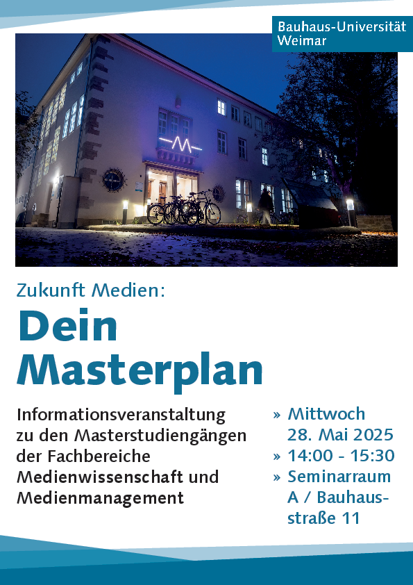 Medienwissenschaft (Master of Arts)Filmkulturen – Extended Cinema (Master of Arts) Medienmanagement (Master of Arts) Media Ecologies (Master of Arts)