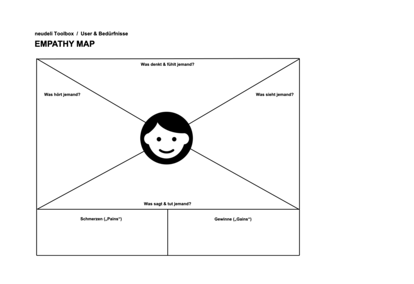 Die Empathy Map ist ein Tool zur empathischen Zielgruppenanalyse. Sie wird genutzt, um die Gefühle, Gedanken und Einstellungen bestehender oder potenzieller Nutzer*innen zu identifizieren und deren Bedürfnisse zu verstehen. Die Empathy Map wird in Kombination mit Qualitativen Interviews eingesetzt, im Rahmen derer man sich mit möglichst offenen W-Fragen einen tiefen Einblick über die Gefühls- und Gedankenwelt der Nutzerin bzw. des Nutzers verschafft. Zudem können auch Erkenntnisse aus Beobachtungen, Selbsttests und Cultural Probes-Studien mit in die Empathy Map aufgenommen werden. Im Vergleich zur Persona fokussiert sich die Empathy Map stärker auf die Gefühlslage der befragten und beobachteten Person. Die Erkenntnisse aus der Empathy Map eignen sich sehr gut, um daraus eine Persona zu entwickeln.