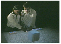 Virtual objects are located on a real "workbench". The objects, displayed as computer generated stereoscopic images are projected onto the surface of a table. The participants operate within a non-immersive virtual environment. A "guide" uses the virtual environment while several observers can watch events by using shutter glasses. Depending on the application, various input and output modules have been integrated, such as motion, gesture and voice recognition systems which characterize the general trend away from the classical multimedia desktop interface.
