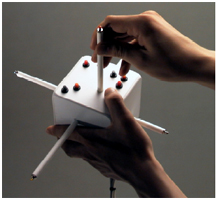 The rods represent the X, Y, and Z axes of a given coordinate system. Pushing and pulling the rods specifies constrained motion along the corresponding axes. Embedded within the device is a six degree of freedom tracking sensor, which allows the rods to be continually aligned with a coordinate system located in a virtual world.