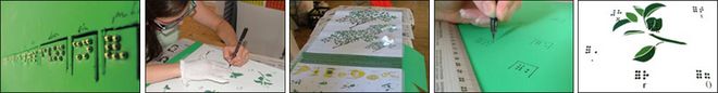 Die Tapete setzt sich aus den einzelnen Phasen des Leselernprozeßes zusammen. Der Grad an Komplexität innerhalb einer Textstruktur steigt mit der Wandhöhe. In durchschnittlicher Sitzhöhe eines 5-jährigen Kindes beginnt die Auseinandersetzung mit einzelnen Buchstaben des Braille-Alphabetes, nach oben hin folgen Worte, dann Sätze und schließlich ein Text.
