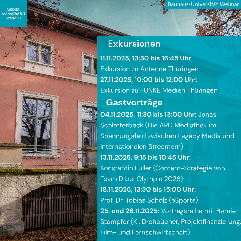 Im Wintersemester 2025/26 wird es im Fachbereich Medienmanagement wieder mehrere Gastvorträge von Wissenschaftlern und Vertretern aus der Medienpraxis geben. Zudem werden die Bachelor- und Masterstudierenden mit den Lehrenden des Fachbereichs Medienmanagement Exkursionen zu Medienunternehmen in Thüringen unternehmen.