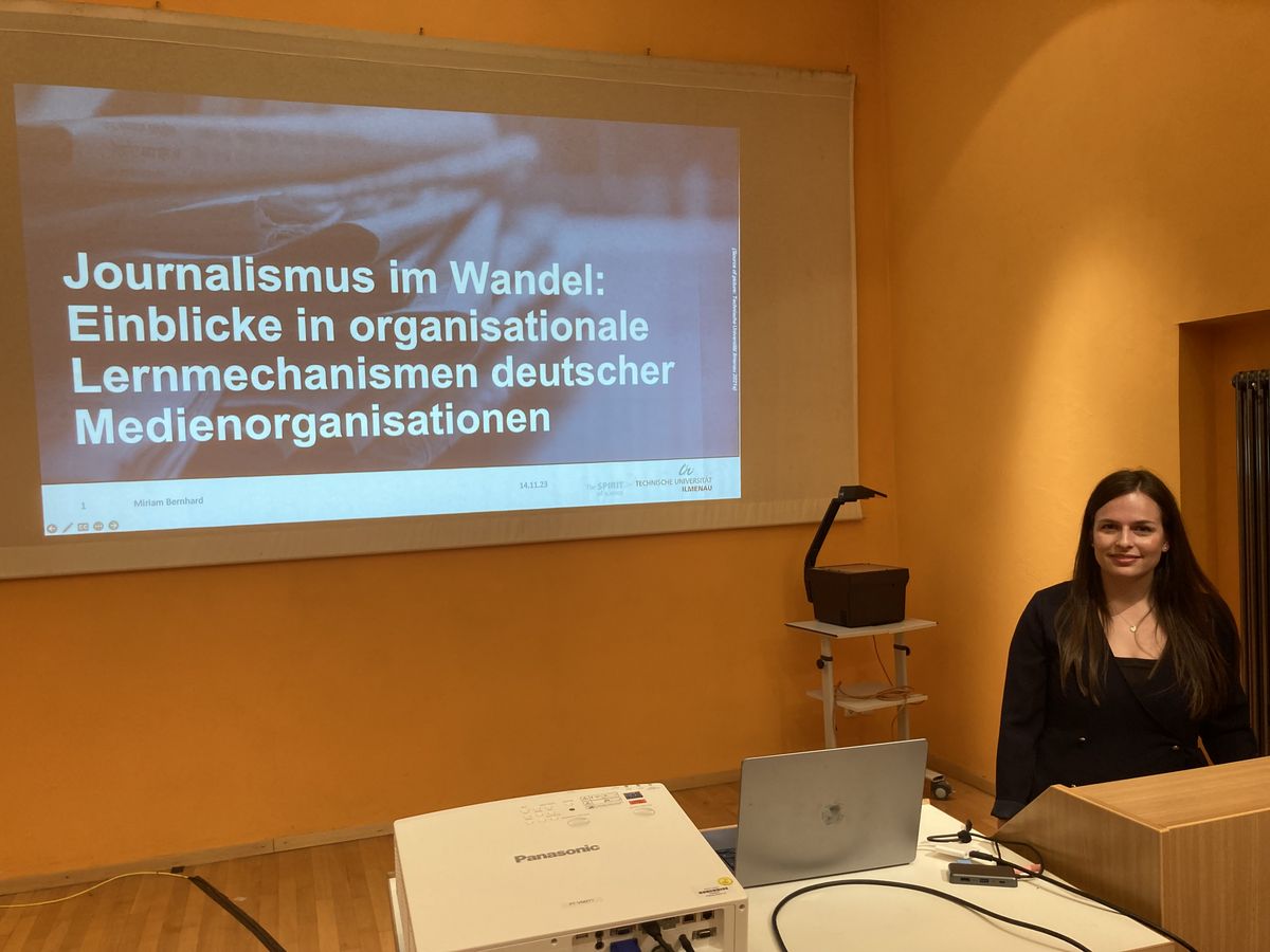 Am 14. November 2023 hielt Miriam Bernhard von der Technischen Universität Ilmenau einen Gastvortrag im Rahmen der Vorlesung „Medienmanagement Theorien und Strategien“ von Prof. Dr. Reinhard Kunz. In ihrer Dissertation beschäftigt sie sich mit den organisationalen Lernmechanismen von Medienunternehmen und legt dabei in ihren Studien einen Schwerpunkt auf journalistisch tätige Organisationen in Deutschland. In ihrem Vortrag teilte sie die wichtigsten Erkenntnisse ihrer bisherigen Forschung zu diesem Thema mit den im Gelben Saal der "Medienvilla" anwesenden Studierenden des Masterstudiengangs Medienmanagement, welche dadurch wertvolle Einblicke in ihre wissenschaftliche Arbeit gewinnen konnten.