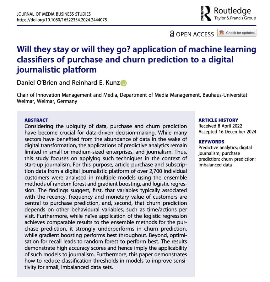 O’Brien, D., & Kunz, R.E. (2024): Will they stay or will they go? Application of machine learning classifiers of purchase and churn prediction to a digital journalistic platform, in: Journal of Media Business Studies. Online: https://doi.org/10.1080/16522354.2024.2444075