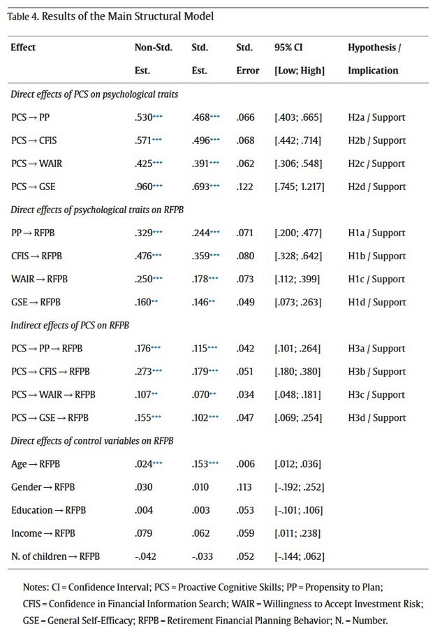 In einer Studie mit 457 Teilnehmenden aus dem Vereinigten Königreich zeigen die Autoren, dass proaktive, trainierbare Entscheidungsfähigkeiten (Proactive Cognitive Skills, PCS) das finanzielle Altersvorsorgeverhalten indirekt über vier psychologische Faktoren fördern: Planungsneigung, Vertrauen in die Finanzinformationssuche, Risikobereitschaft und Selbstwirksamkeit. Finanzielle Bildung und numerische Fähigkeiten übernehmen dabei moderierende Rollen.