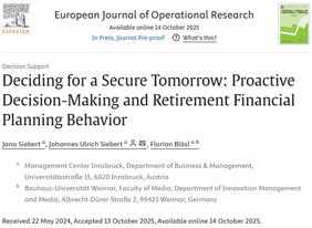 Siebert, J., Siebert, J. U., & Blösl, F. (2025). Deciding for a secure tomorrow: Proactive decision-making and retirement financial planning behavior. European Journal of Operational Research. Advance online publication.https://doi.org/10.1016/j.ejor.2025.10.021