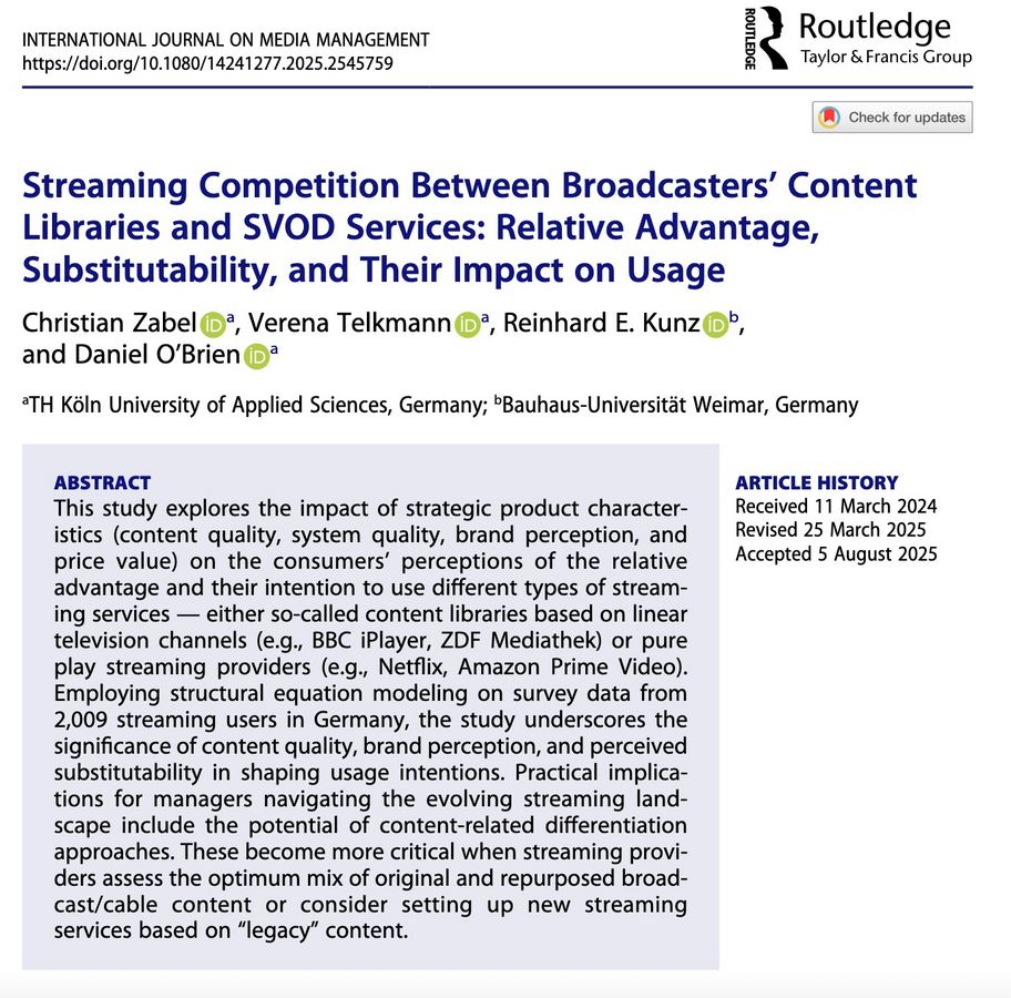 Zabel, C., Telkmann, V., Kunz, R.E. & Daniel O’Brien (2025): Streaming Competition Between Broadcasters’ Content Libraries and SVOD Services: Relative Advantage, Substitutability, and Their Impact on Usage, in: International Journal of Media Management. Online: https://www.tandfonline.com/doi/full/10.1080/14241277.2025.2545759