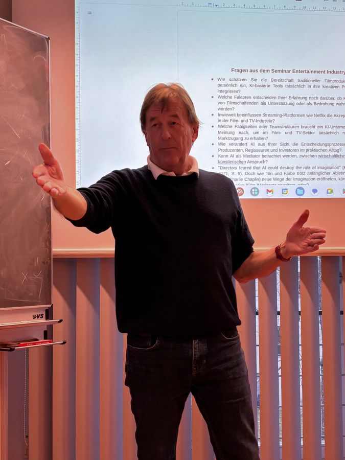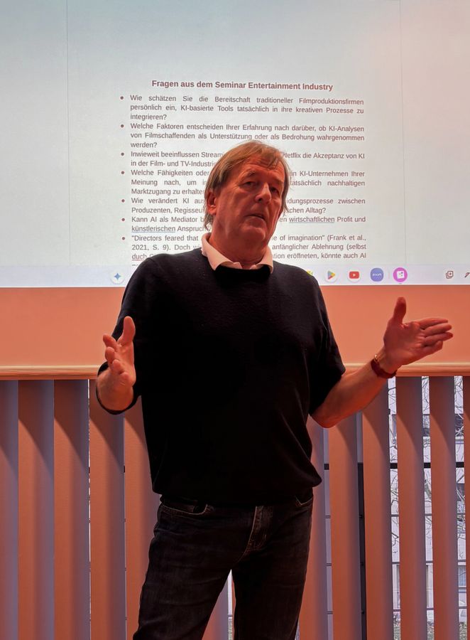 Am 25. und 26. November fand in den Veranstaltungen des Lehrstuhls für Innovationsmanagement und Medien eine Vortragsreihe zum Themenfeld Filmproduktion und -finanzierung statt. Filmproduzent Bernie Stampfer referierte dabei in drei Formaten: Im Seminar Entertainment Industry am Dienstag beantwortete er Fragen der Studierenden des Masters Medienmanagement – mit besonderem Schwerpunkt auf dem Einsatz und den Potenzialen von KI in der Filmproduktion. Anschließend gab er den Studierenden des Bachelors Medienkultur in der Vorlesung Medienunternehmen und Medientechnologien einen Überblick über die europäische Filmlandschaft. Am Mittwoch sprach er mit den Studierenden des Masters Medienmanagement über die Aufgaben eines Produzenten und stellte spannende Filmprojekte aus seiner über 40-jährigen Karriere vor.