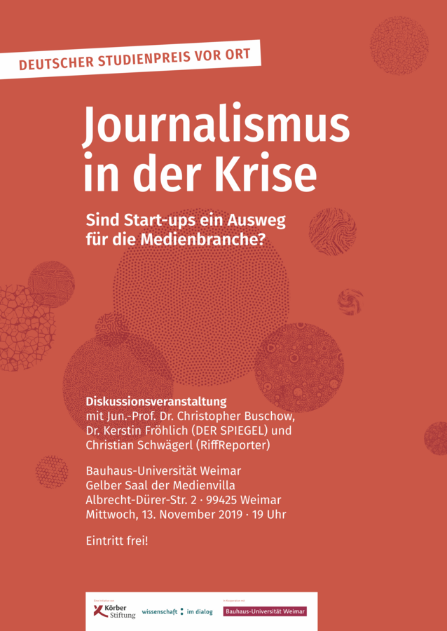 Im Rahmen der Dialogreihe „Deutscher Studienpreis vor Ort“ wird Jun.-Prof. Dr. Buschow am Mittwoch, 13. November 2019 um 19.00 Uhr im Gelben Saal der Medienvilla, Albrecht-Dürer-Str. 2 in Weimar mit Dr. Kerstin Fröhlich, Innovationsmanagement beim SPIEGEL und Christian Schwägerl, Mitgründer des journalistischen Start-ups RiffReporter diskutieren. Der Abend wird moderiert von der Wissenschaftsjournalistin Monika Seynsche. Alle Interessierten sind herzlich eingeladen, eine Anmeldung ist nicht erforderlich, der Eintritt ist frei.