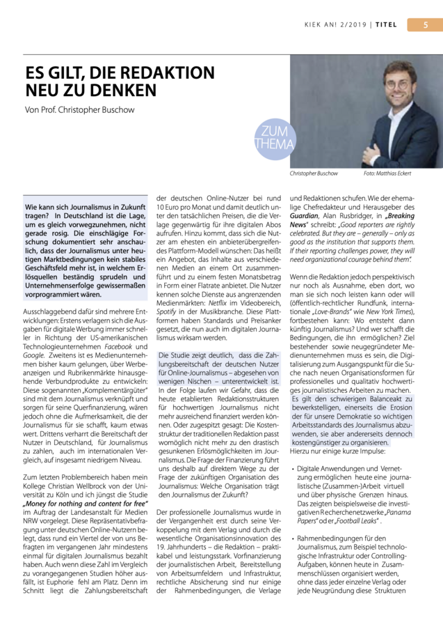 Das Heft widmet sich dem Themenbereich „Journalismus auf Geldsuche“. Christopher Buschows einleitende Gastkolumne kann im Volltext des Magazins nachgelesen werden.