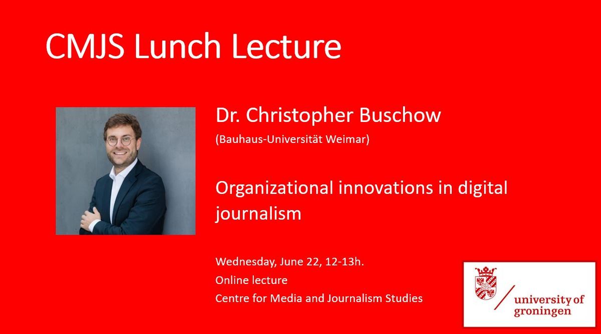 Buschow war auf Einladung von Dr. Frank Harbers und Prof. Dr. Marcel Broersma mit dem digitalen Vortrag „Organizational Innovations in Digital Journalism“ zu Gast in der „CMJS Lunch Lecture“ der Universität.
