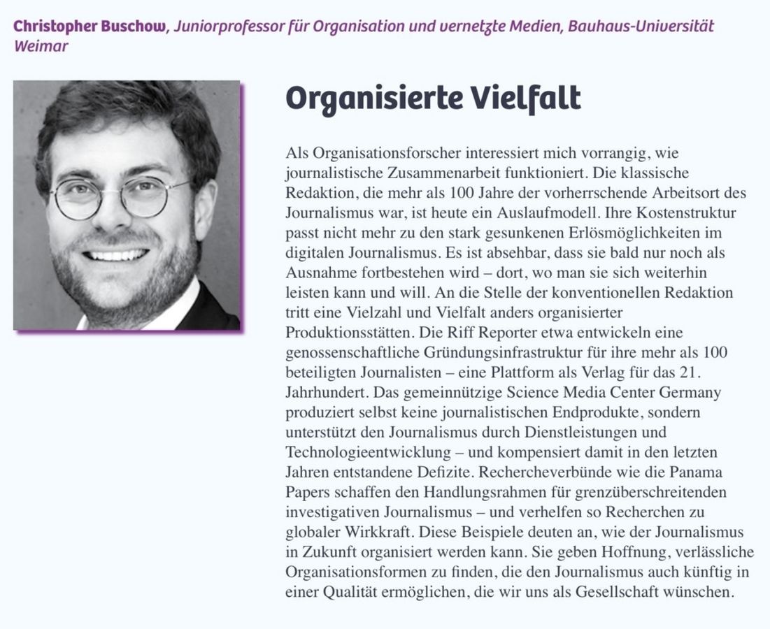 Zu dem Thema haben außerdem u.a. Prof. Jeff Jarvis (CUNY), Heribert Prantl (Süddeutsche Zeitung), Katja Gloger (Reporter ohne Grenzen), Benjamin Fredrich (KATAPULT - Magazin für Kartografik und Sozialwissenschaft), Prof. Dr. Tanjev Schultz (Johannes Gutenberg-Universität Mainz), Tilo Jung und zahlreichen Leser*innen beigetragen.
