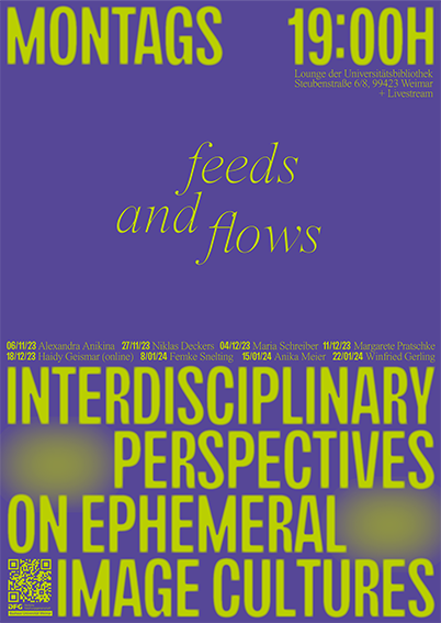 Die Vorlesungsreihe "Feeds & Flows: Interdisziplinäre Perspektiven auf ephemere Bildkulturen" verortet Feeds in der Geschichte transitorischer Bild(schirm)medien sowie alltäglicher Medienpraktiken und fragt: Wie (ko-)produzieren plattformspezifische Infrastrukturen im surface und Datenpraktiken und Algorithmen im subface sozialer Medien einen stetigen Fluss von (bewegten) Bildern? Wie prägen wirtschaftliche Interessen, Plattformpolitiken und kapitalistische Geschäftsmodelle digitale Bildkulturen und alltägliche Praktiken des Umgangs mit Bilderfeeds? Welche Konzepte fehlen in aktuellen bildtheoretischen Ansätzen, um Bilderfeeds als flüchtige Bildschirmphänomene adäquat zu beschreiben? Wir schlagen vor, Feeds und Flows als Assemblagen zu begreifen, die das Aufeinandertreffen von Nutzer*innen, Netzwerken, Bildern und Algorithmen organisieren und arrangieren. Was kokonstituiert also die Feeds und Flows vernetzter Bilder?