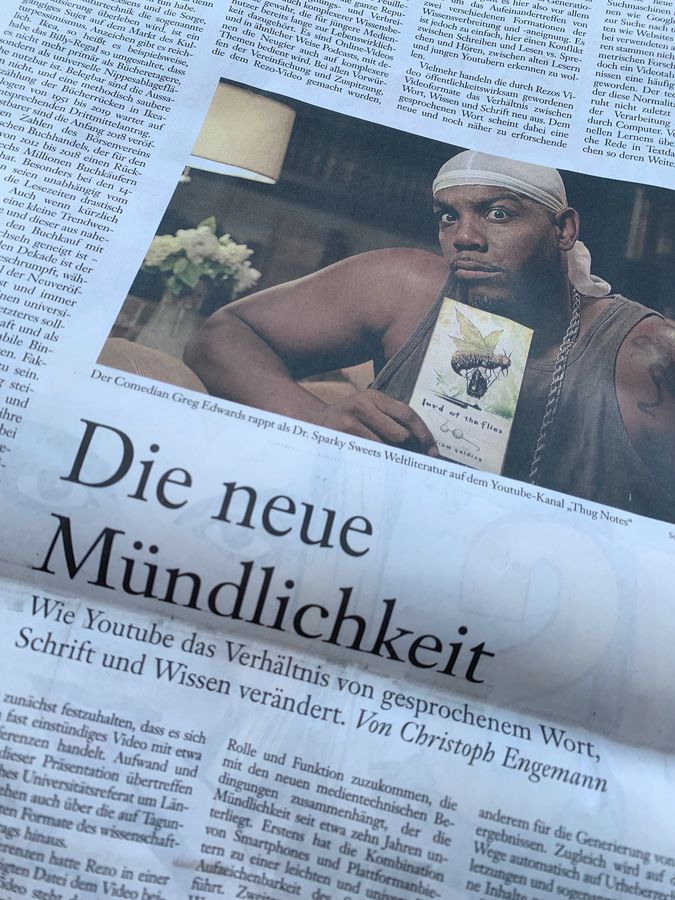 Im Feuilleton-Spezial zu Youtube der Frankfurter Allgemeinen Sonntagszeitung vom 17.06.2019 hat Christoph Engemann, Postdoc für Gesellschaft und Digitalisierung an der Professur für Theorie medialer Welten, einen Beitrag zum Verhältnis zwischen Sprechen, Schreiben und Wissen in online Videos veröffentlicht. Der Beitrag ist in der Printausgabe erhältlich.