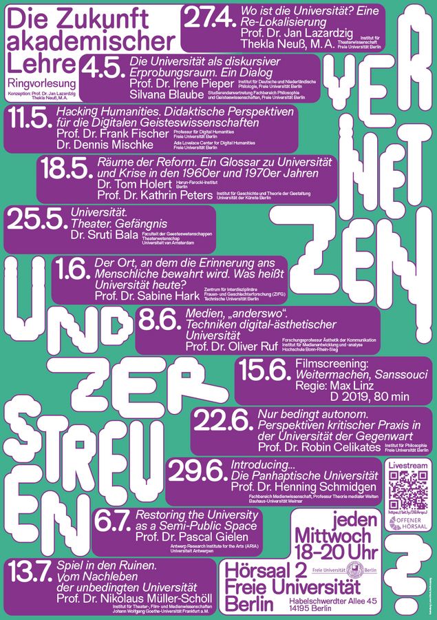 „Nun, da die Rückkehr in die Seminarräume und Vorlesungssäle eingeläutet ist, stellt sich die Frage, was tun, mit der mühsam erworbenen Kompetenz, zeitlich und räumlich auf Distanz gehen zu können? Was passiert mit der pandemischen Expertise einer auf Distanzmedien basierten Lehre? Kann die Universität durch sie inklusiver und nachhaltiger werden? Oder eröffnen sich durch sie neue Formen der Verwertung und Finanzialisierung? Wie ändert sich die Universität als gebauter und sozialer Ort? Wie kann sich das Miteinander von Forschenden und Lernenden in Zukunft gestalten? Welche Rolle wird der Ort und die Ortsgebundenheit des Studiums spielen? Welche Konsequenzen ergeben sich für die seminarbasierten Erkenntnistechniken der Diskussion, des Fragens, des gemeinsamen Lesens?“