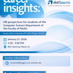 Wie gelingt der Einstieg in die IT-Branche – und welche Kompetenzen sind gefragt? Mit der neuen Veranstaltungsreihe »Career Insights« lädt die Fakultät Medien gemeinsam mit dem Career Service der Bauhaus-Universität Weimar Studierende dazu ein, regionale IT-Unternehmen kennenzulernen und direkt von Expert*innen aus der Praxis zu erfahren, worauf es im Bewerbungsprozess ankommt.