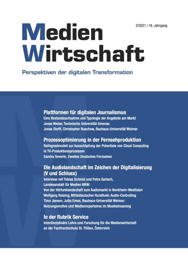 Ein Schlüsselthema der Juniorprofessur für Organisation und vernetzte Medien greifen Jonas Weber, M.A. (TU Ilmenau), Jonas Steffl, M.A. und Jun.-Prof. Dr. Christopher Buschow (beide Bauhaus-Universität Weimar) auf. In»Plattformen für digitalen Journalismus in Deutschland« präsentiert das Forscherteam eine explorative Bestandsaufnahme und Typologie von Anbietern am deutschen Markt, die journalistische Inhalte verschiedener Verlage zu einem Gesamtpaket bündeln – ähnlich eines »Spotify für Nachrichten«. Sie identifizieren insgesamt 39 Angebote, die in vier Plattformtypen gegliedert werden: Aggregatoren, abonnementbasierte Plattformen, Online-Kioske und Einzelartikel-Kioske. Die Studie unterstreicht, dass die aktuell vorliegenden Journalismusplattformen keine wirklich neuartige Produkt- oder Darreichungsform für Medieninhalte darstellen, sondern eher als ein zusätzlicher Distributionskanal verstanden werden.