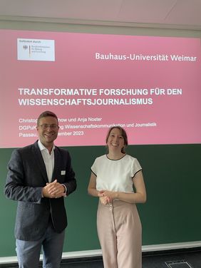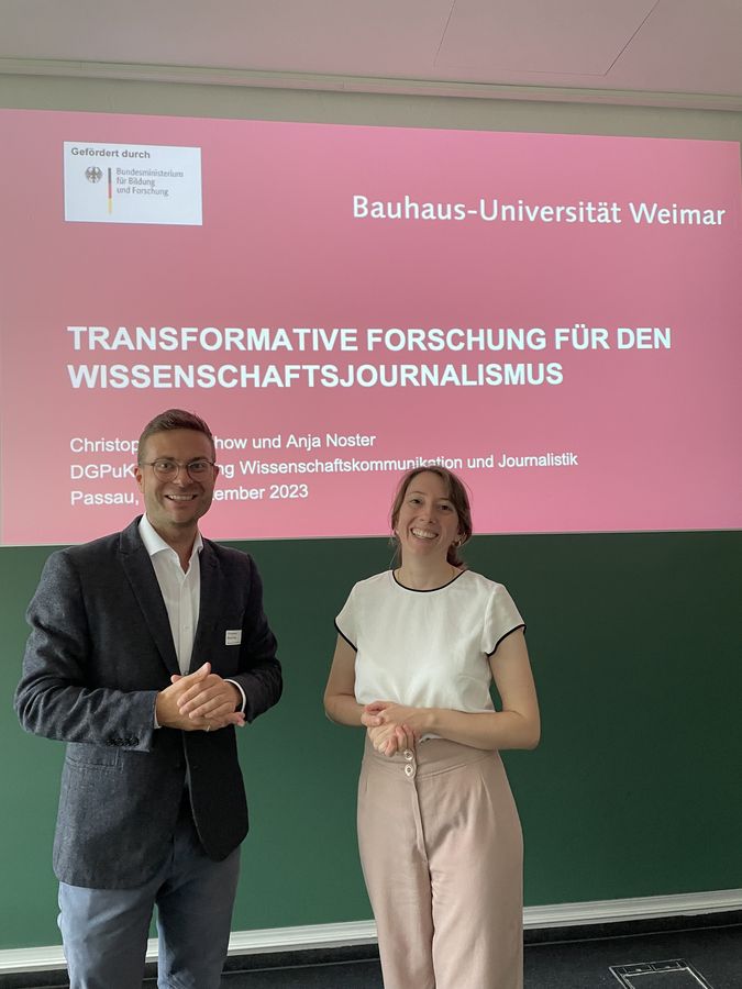 Jun.-Prof. Dr. Christopher Buschow und Anja Noster, Wissenschaftliche Mitarbeiterin an der Juniorprofessur für »Organisation und vernetzte Medien«, präsentierten am 21. September 2023 im Rahmen der Fachkonferenz »Gesellschaftswissen schaffen« aktuelle Erkenntnisse aus dem Verbundforschungsprojekt »TRANSFORM«.