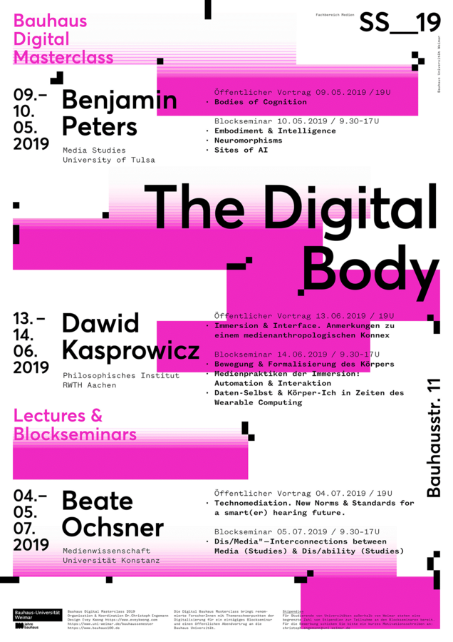 Die Bauhaus Digital Masterclass bringt dreimal pro Semester renommierte nationale und internationale Forschende und Lehrendende für einen Abendvortrag und ein eintägiges Blockseminar an die Bauhaus-Universität Weimar. Die Seminare widmen sich Grundlagenfragen der Digitalisierung im Schnittfeld zwischen Architektur, Design und Medien und richten sich an Studierende aller Fakultäten der Bauhaus-Universität Weimar.