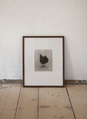 Belichtung spielt auch in der Arbeit des Preisträgers Snirt Blearcher (Visuelle Kommunikation) eine Rolle: Er sammelte über Wochen hinweg Eier des abgebildeten Huhns um mit dessen Eiweiß Albumin herzustellen, das für die Belichtung des Werkes verwendet wurde. Hier stellt sich die Frage was zuerst war: Ei oder Huhn.
