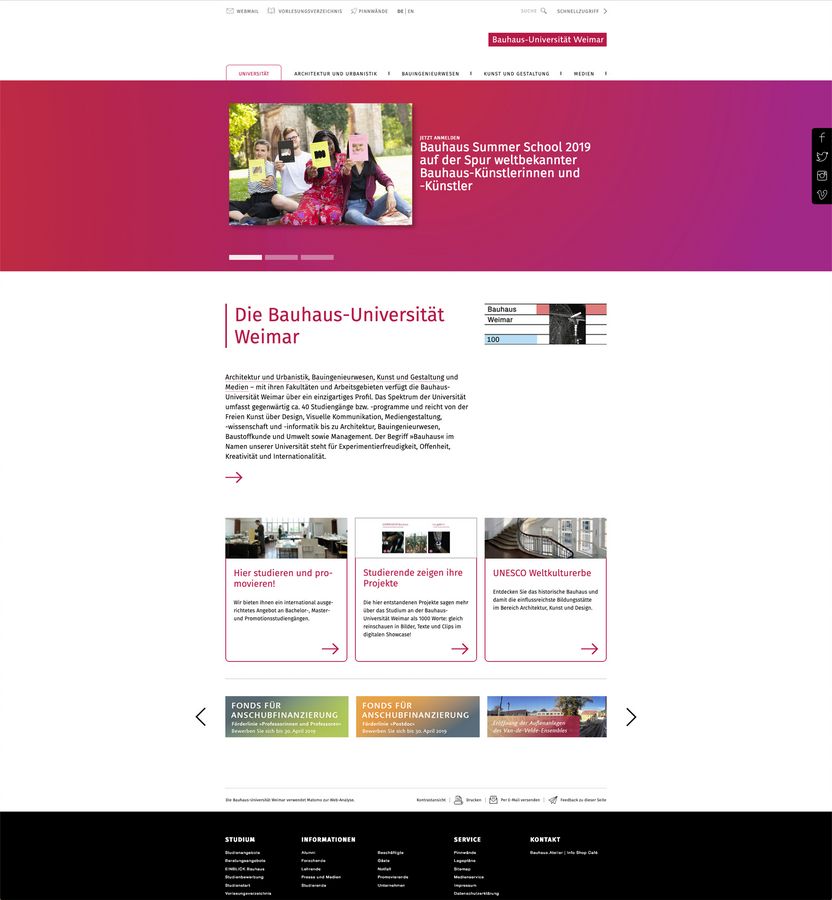 Das neue Design hat seine Stärken ebenfalls in der deutlichen Verbesserung der Usability: die Seiten sind klar strukturiert, aktuelle Inhalte und Hinweise auf Veranstaltungen etc. können prominent präsentiert werden und die Responsivität hat sich deutlich verbessert. Damit trägt die Bauhaus-Universität Weimar auch dem deutlich gesteigerten Interesse im Bauhaus-Jubiläumsjahr Rechnung. Ebenso wird der Zugang zu den Angeboten und Inhalten der Universität besonders für die internationalen Studierenden erleichtert – eine im deutschlandweiten Vergleich an der Bauhaus-Universität Weimar stark vertretene Gruppe.
