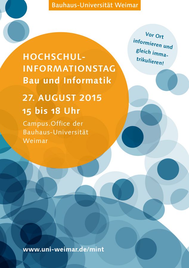 Technik-, Naturwissenschafts- und Informatikbegeisterte erhalten von 15 bis 18 Uhr Antworten auf individuelle Fragen zu den drei Studiengängen Medieninformatik, Bauingenieurwesen [Konstruktion Umwelt Baustoffe] und Management [Bau Immobilien Infrastruktur] sowie zur Studienorganisation und dem Leben in Weimar. Was zeichnet die Bachelorstudiengänge in Bau und Informatik an der Bauhaus-Universität Weimar aus? In welchen Werkstätten und Labors wird gearbeitet? Welche Berufsperspektiven und Entwicklungsmöglichkeiten erwarten mich nach dem Studium? Die vielen Fragen, denen sich Studieninteressierte oft gegenüber sehen, können am besten im persönlichen Gespräch beantwortet werden. Hierfür stehen an diesem Nachmittag zahlreiche Ansprechpartner aus der Allgemeinen Studienberatung, dem Studentenwerk Thüringen und den Fachstudienberatungen zur Verfügung.