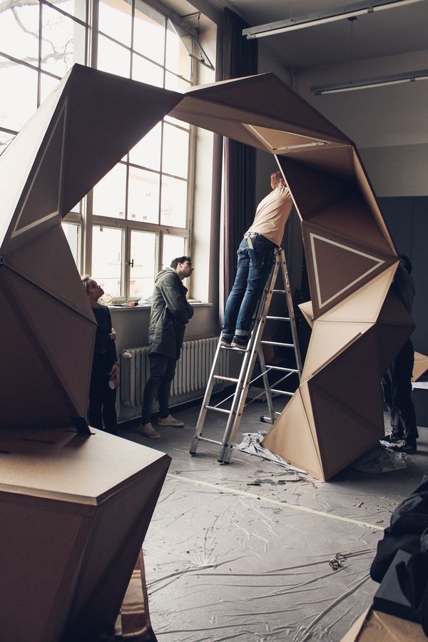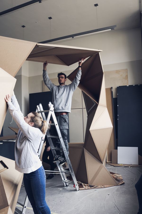 Unter der Vorgabe, als Hauptmaterial für den Stand Papier oder papierähnliche Stoffe zu verwenden, führten die Studierenden zunächst zahlreiche Materialexperimente durch und erprobten verschiedene Verarbeitungstechniken. Workshops in Lichtgestaltung und Ausstellungsdesign gaben gestalterischen Input für die Entwurfsphase.