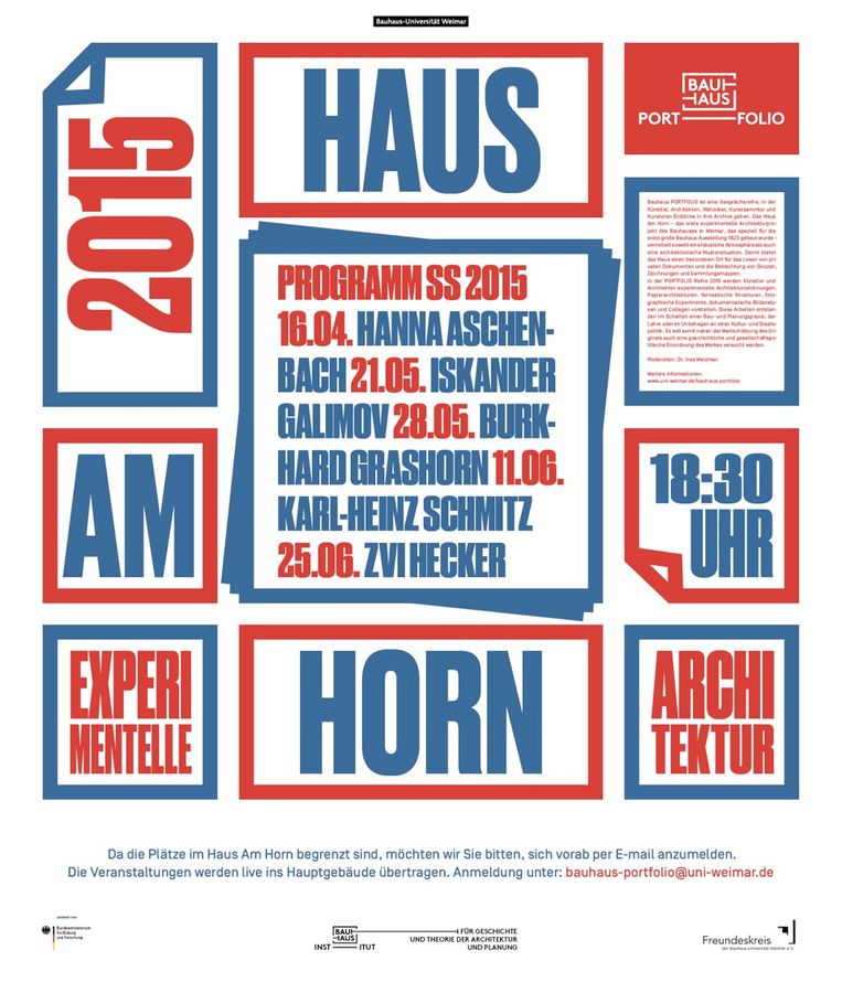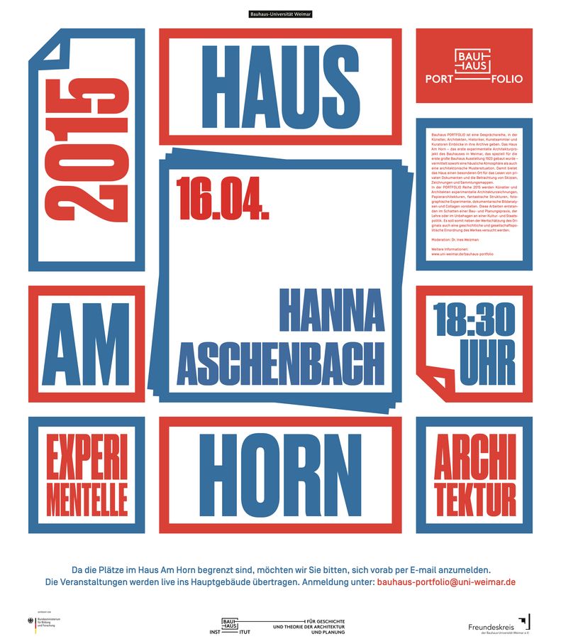Wegen begrenzter Plätze im Haus Am Horn wird um Anmeldung per E-Mail gebeten (bauhaus-portfolio[at]uni-weimar.de). Die Veranstaltungen werden live ins Hauptgebäude übertragen und als Live-Stream über die Webseite des Bauhaus-Instituts für Geschichte und Theorie der Architektur und Planung Live übertragen: www.uni-weimar.de/bauhaus-portfolio