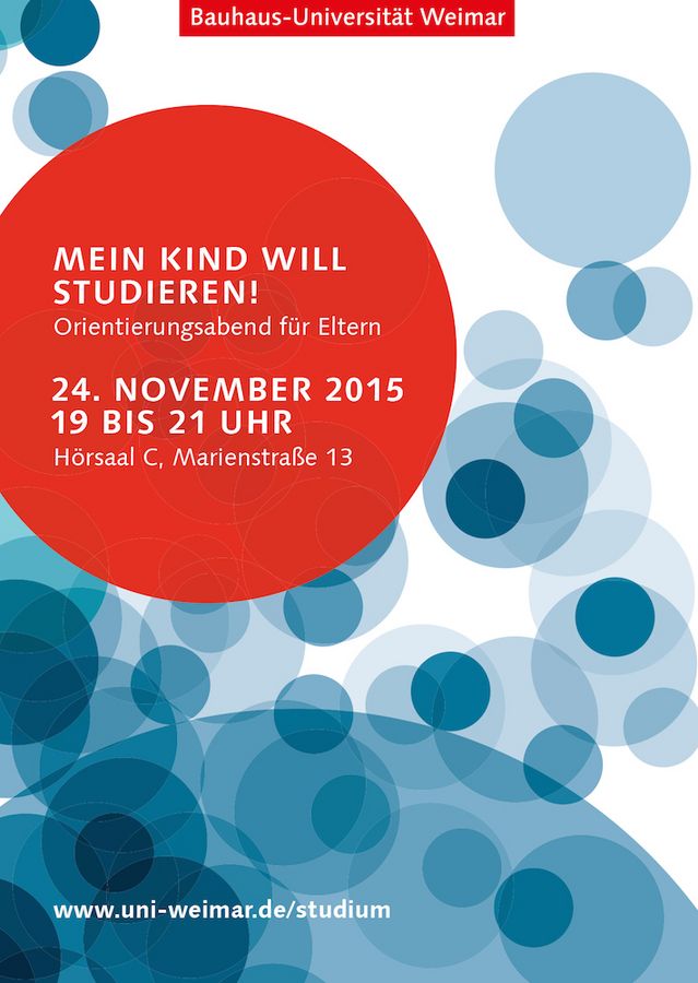 Was kostet und wie finanziert sich ein Studium? Welche Abschlüsse gibt es und wie sind die Job-Aussichten? Der Informationsabend bietet Eltern die Gelegenheit, einen ersten Ein- und Überblick in den Universitätsalltag und die einzelnen Studiengänge der Bauhaus-Universität Weimar zu erhalten. Darüber hinaus informieren die Studienberatung und Studierende über die sozialen Rahmenbedingungen wie Mietkosten und das studentische Leben in der Kultur- und Universitätsstadt.