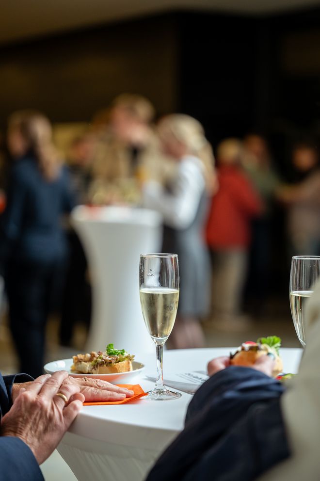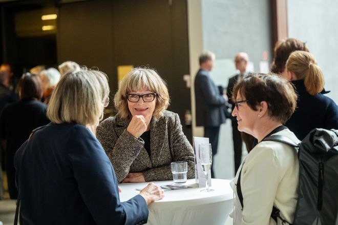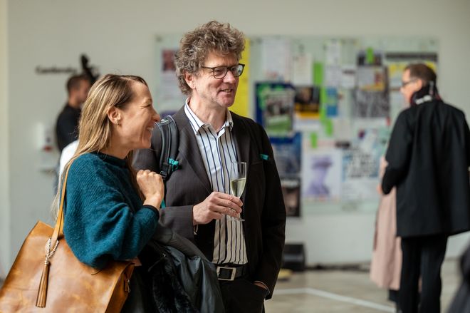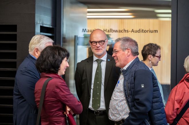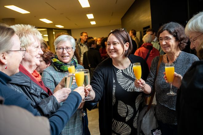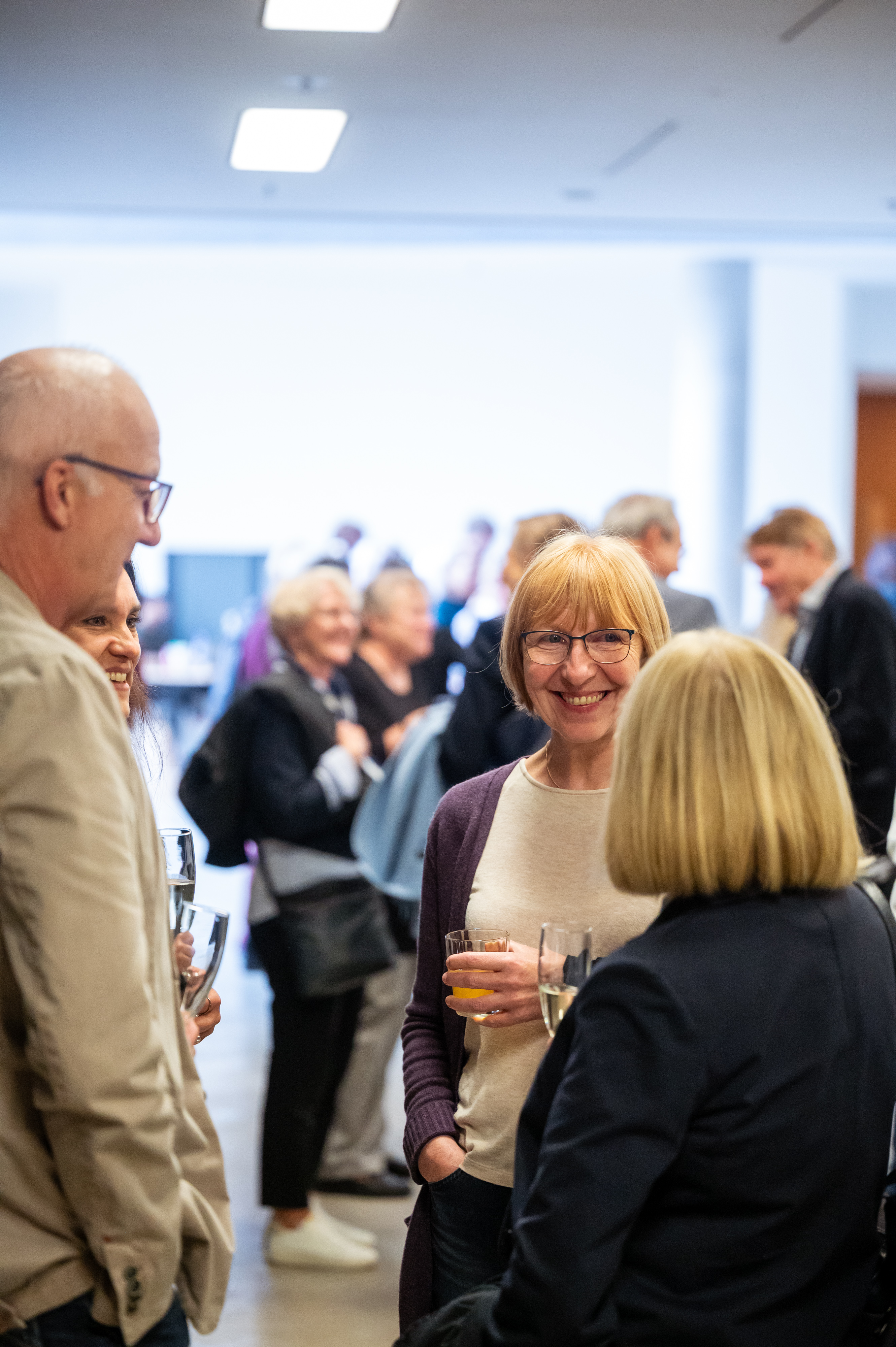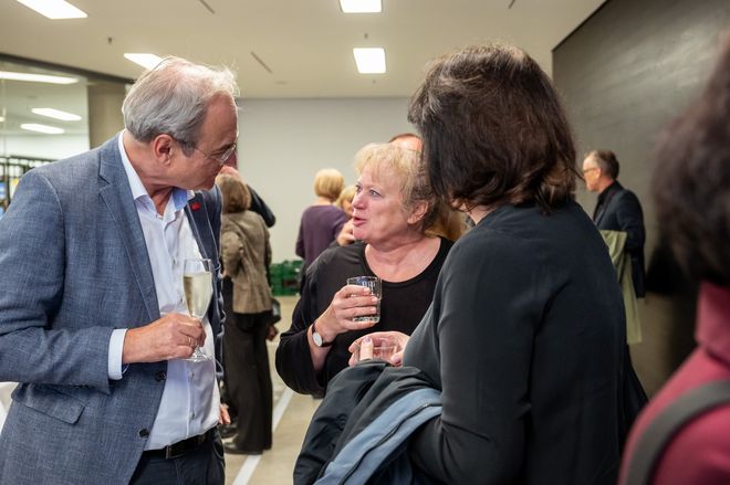 Beim anschließenden Empfang im unteren Foyer kamen Gäste und Mitarbeitende ins Gespräch – genau dort, wo heute täglich Lerngruppen zusammenkommen und einst schon Szenen für den »Tatort« mit Christoph Waltz gedreht wurden.