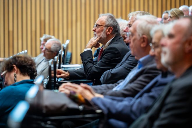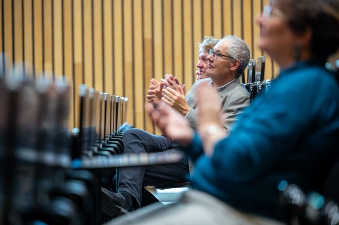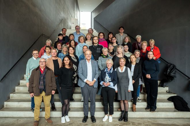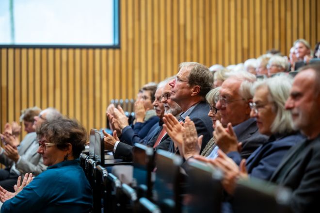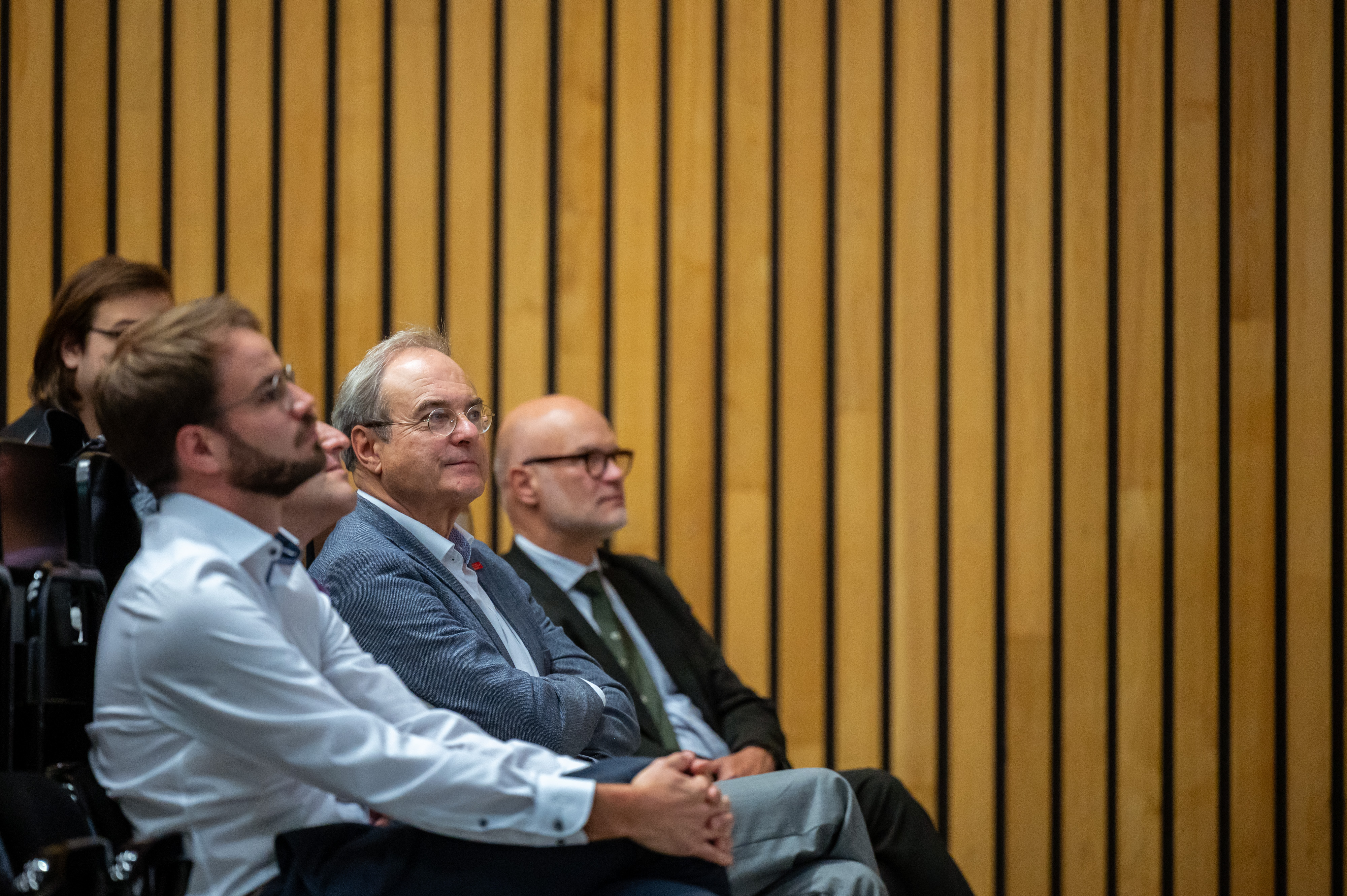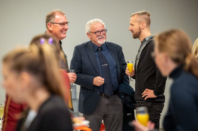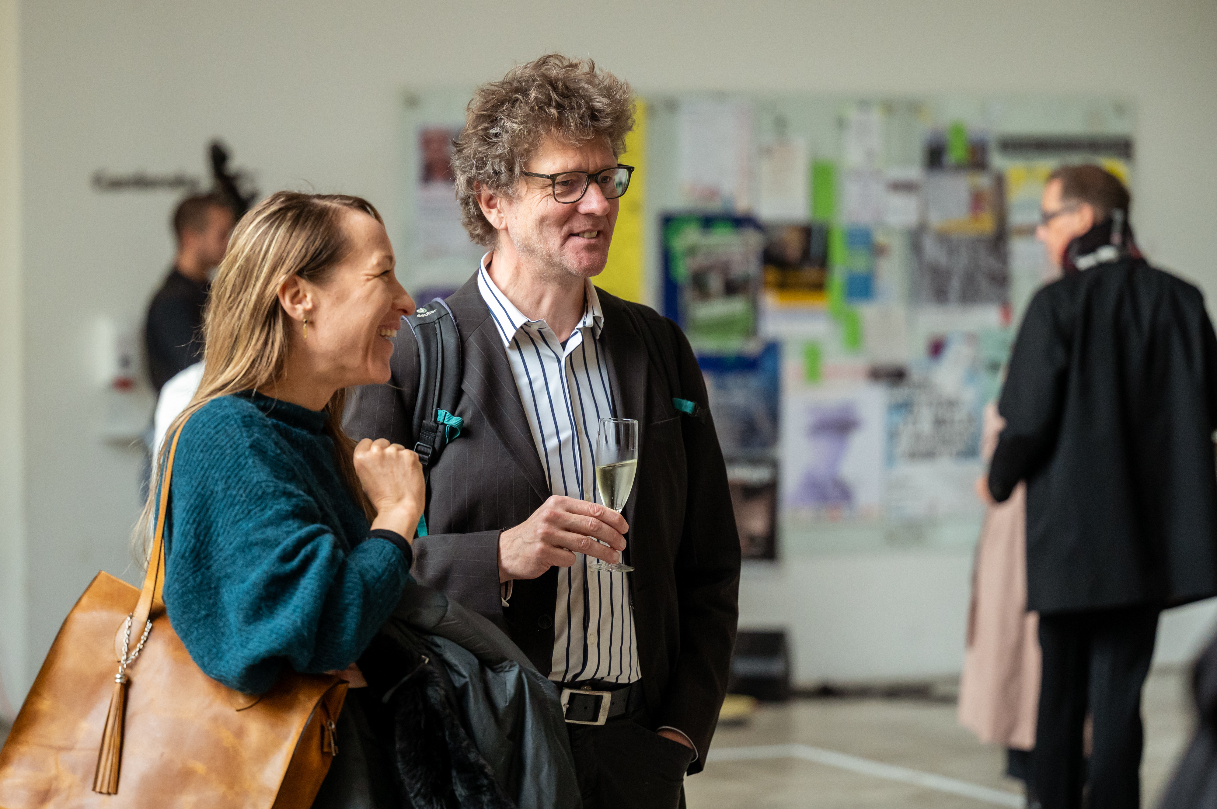 Beim anschließenden Empfang im unteren Foyer kamen Gäste und Mitarbeitende ins Gespräch – genau dort, wo heute täglich Lerngruppen zusammenkommen und einst schon Szenen für den »Tatort« mit Christoph Waltz gedreht wurden.