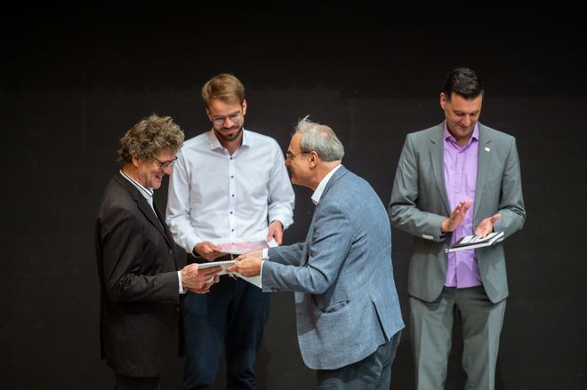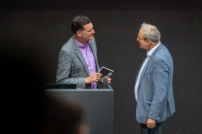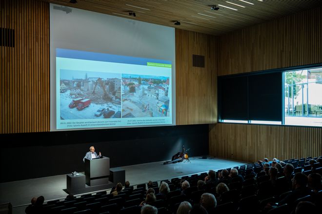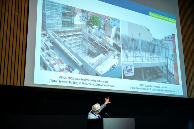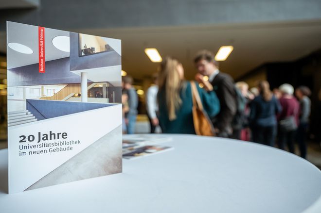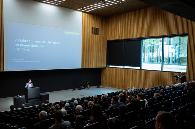 Mit einem Festakt im Maurice-Halbwachs-Auditorium feierte die Bauhaus-Universität Weimar am 10. Oktober das 20-jährige Bestehen der Universitätsbibliothek im neuen Gebäude. Präsident Prof. Peter Benz eröffnete die Veranstaltung mit einem Augenzwinkern: »Wir alle feiern uns alle – und dieses wunderbare Gebäude ist der Anlass.«