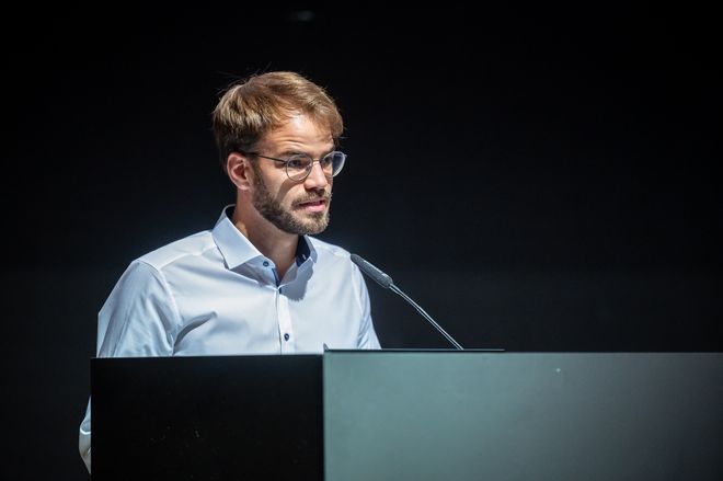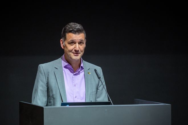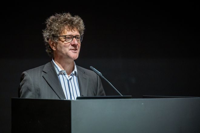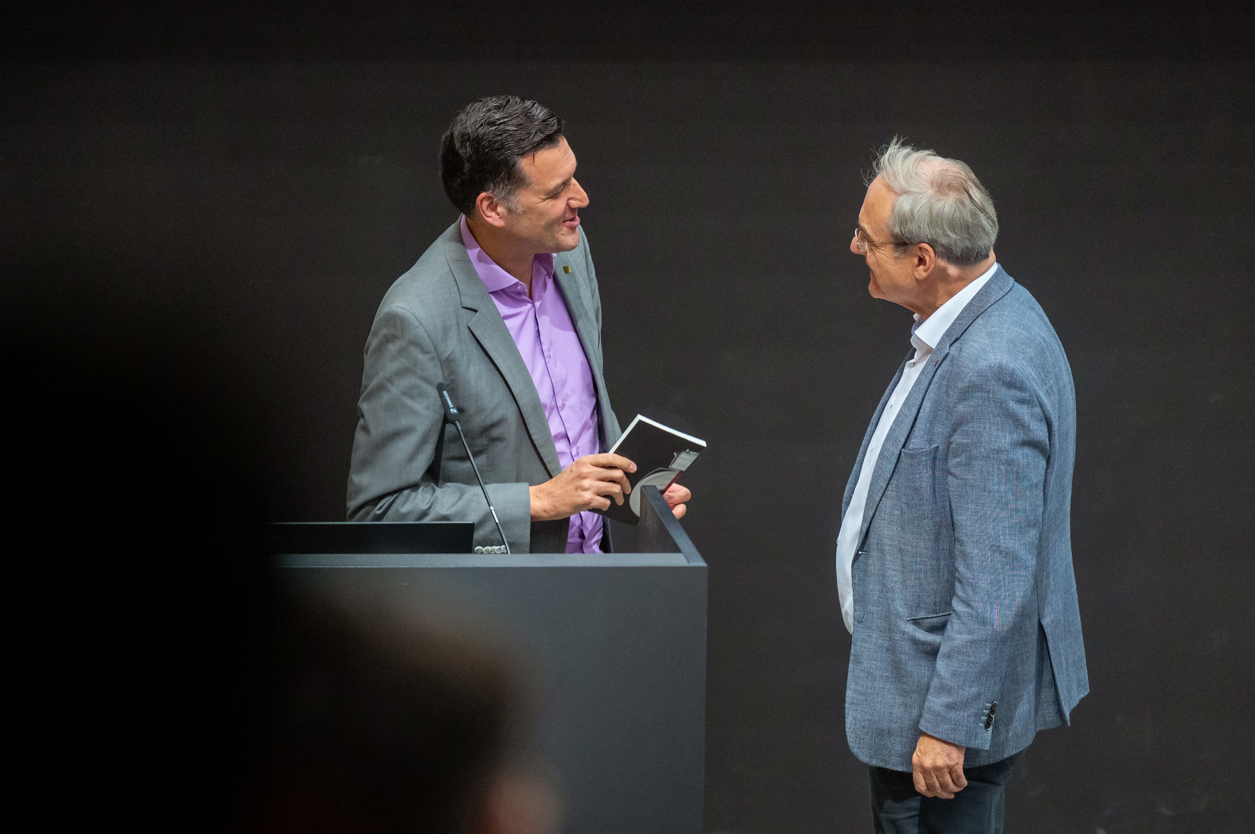 Prof. Dr. Helmut Heit, Leiter des Kollegs Friedrich Nietzsche der Klassik Stiftung Weimar, bot in seiner Ansprache eine inspirierende Außenperspektive auf den Ort des Lesens und Denkens, bevor Bibliotheksdirektor Dr. Frank Simon-Ritz das Publikum auf eine Reise durch zwei Jahrzehnte Bibliotheksgeschichte mitnahm – von der Grundsteinlegung und dem Beginn der Bauarbeiten bis hin zum lebendigen Lernort von heute. Dabei machte er deutlich: Die Bibliothek bleibt im Wandel – künftig will man den Betrieb noch nachhaltiger, energieeffizienter und barrierefreier gestalten.