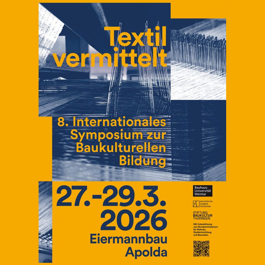 Vom Freitag, 27. bis Sonntag, 29. März 2026 findet das 8. Internationale Symposium zur Baukulturellen Bildung im Eiermannbau in Apolda statt. Das bundesweite Forum bietet unter dem Motto »Textil vermittelt« Raum für Austausch und Diskussion über die Bedeutung der baukulturellen Bildung.