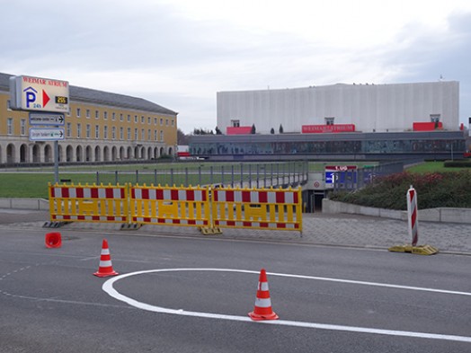 Die späte Weimarer Republik sah das »Kulturprojekt« samt Weimarhalle als ein Modell für Deutschland an. Bis Ende des Zweiten Weltkrieges war das erste und einzige auch gebaute »Gauforum« – zusammen mit einem System der Zwangsarbeit und einem Konzentrationslager – modellhaft für das nationalsozialistische Deutschland. In der DDR-Zeit wiederum galten der Weimarer »Lange Jakob« und die »Mehrzweckhalle« als Modell für den Umgang des sozialistischen Staates mit dem städtebaulichen Erbe der NS-Zeit. Jeder dieser drei Phasen widmet Kurator Harald Bodenschatz, Center for Metropolitan Studies am Institut für Kunstwissenschaft und Historische Urbanistik der Technischen Universität Berlin, eine eigene Wand in der Ausstellung. Die vierte, den ›Bezugsraum‹ vollendende Wand thematisiert die gegenwärtige Entwicklung: den Neubau des bauhaus museums weimar.
