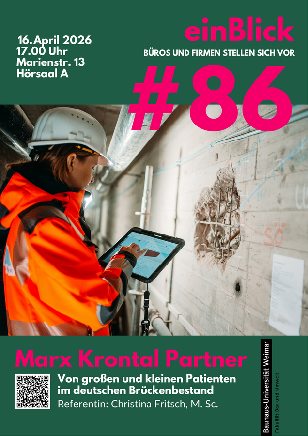 Mit Beginn des Sommersemesters 2011 startete an der Fakultät Bau- und Umweltingenieurwissenschaften der Bauhaus-Universität Weimar erstmalig die Vortragsreihe »einBlick«. Im Rahmen der Veranstaltung berichten Gäste aus der ingenieurtechnischen Praxis, um Studierenden, Mitarbeiter*innen und allen Interessierten Projekte und Erfahrungen aus ihrem Arbeitsleben vorzustellen.