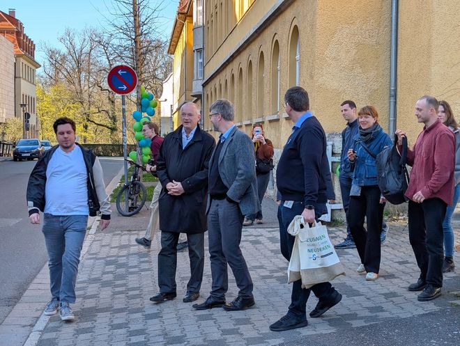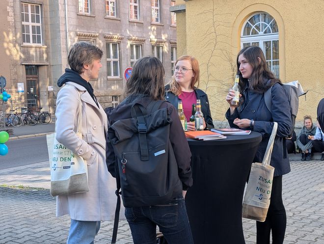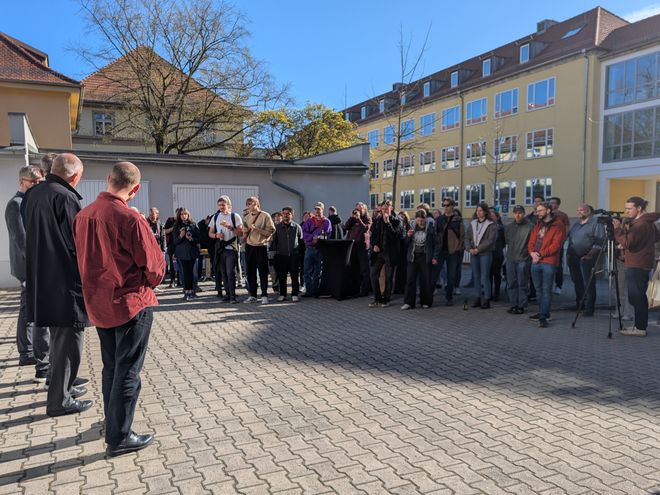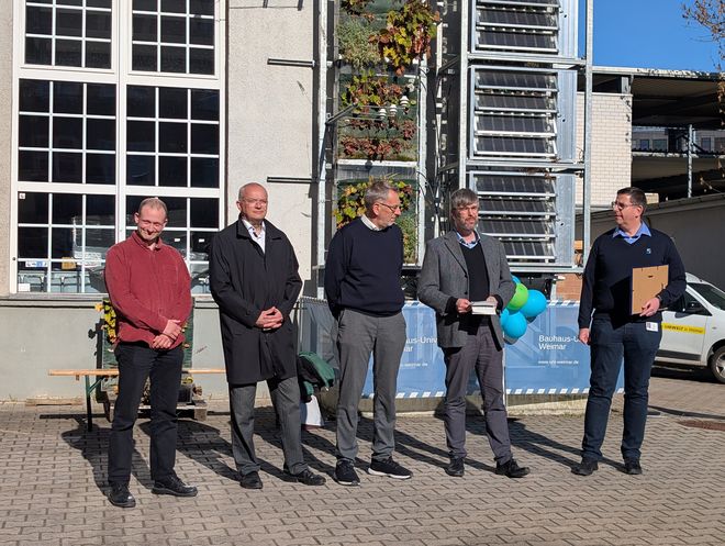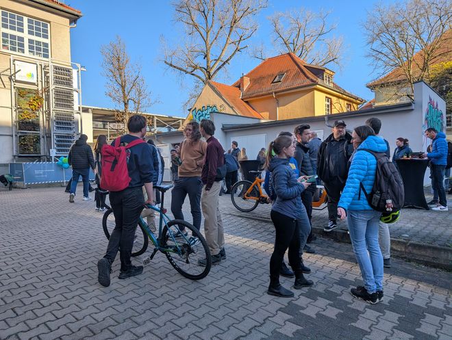 Rund 50 Gäste versammelten sich auf dem Hof der Coudraystraße 10, um das Sommersemester einzuläuten und eine besondere Kooperation zu würdigen: In Projekten wie »H2well« und »MOVEwell« arbeiten Universität und Stadtwirtschaft an zukunftsweisenden Themen wie der Erforschung und Anwendung von Wasserstofftechnologie sowie dem automatisiertem und vernetztem Fahren. Um diesen Transfer sichtbarer zu machen, gestalteten die Praxispartner einen Wasserstoffbus aus der Flotte des Weimarer ÖPNV neu.
