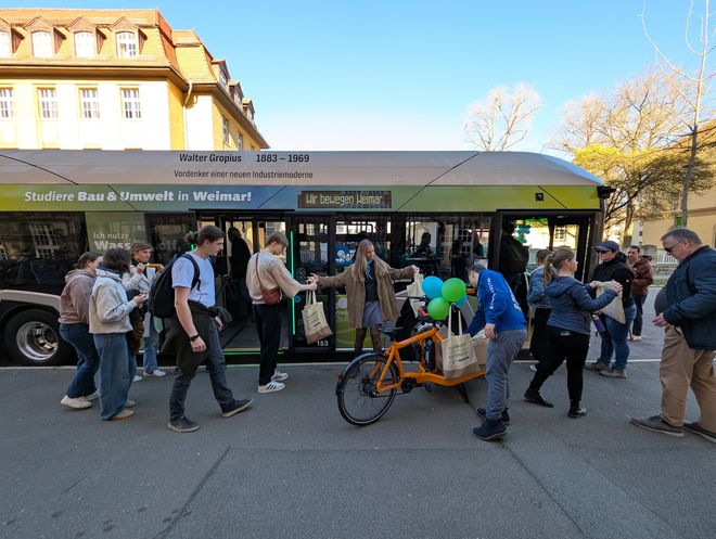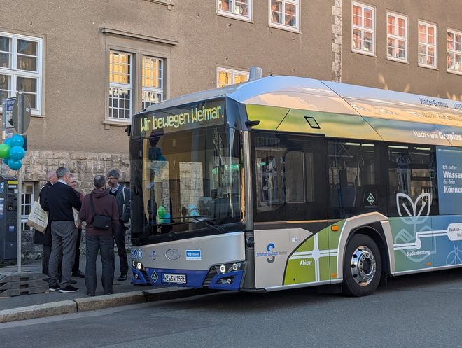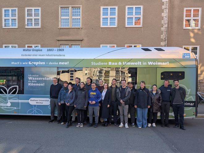 Im Rahmen einer Begrüßungsveranstaltung für Studierende der Umweltingenieurwissenschaften wurde am 8. April 2026 der neu gestaltete Wasserstoffbus »Walter Gropius« von Bauhaus-Universität Weimar und Stadtwirtschaft Weimar GmbH feierlich eingeweiht. Der Bus steht exemplarisch für die enge Zusammenarbeit von Wissenschaft und kommunaler Praxis – und macht diese nun im Stadtbild sichtbar.