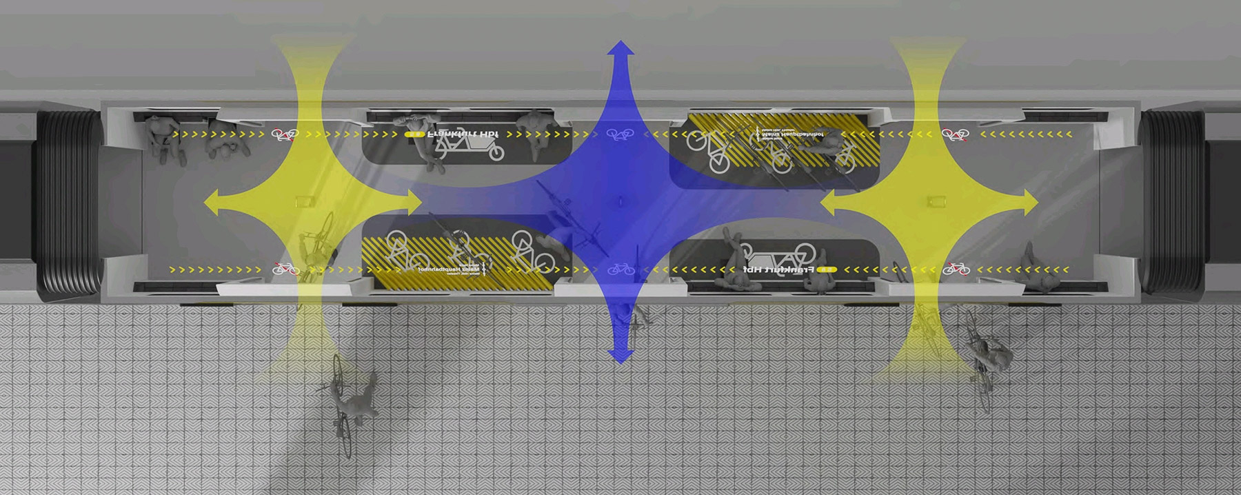 Mit »Velocity« entwickelte Felix Stockhausen eine Lösung für den S-Bahnverkehr der Zukunft: ein Fahrradabteil mit Leitsystem, das das gleichzeitige Ein- und Ausladen von Fahrrädern auch bei kurzen Haltezeiten ermöglicht. »Ich habe ein optimiertes Fahrradabteil entworfen, das durch separate Eingangs- und Ausgangstüren ein effizientes Be- und Entladen erlaubt – selbst bei dichter Zugtaktung und kurzen Stopps«, erklärt der Produktdesigner. »Definierte Bodenzonen, eine klare Wegeführung und ein eigenes Leitsystem sorgen für einen reibungslosen Ablauf, besonders zu Stoßzeiten. »Herzstück ist eine Funktionswand mit weichen, konisch geformten Halteelementen, die den dynamischen Anforderungen im S-Bahn-Betrieb sowohl funktional als auch ästhetisch gerecht wird. Sie ermöglicht das flexible, nahezu stufenlose Abstellen der Fahrräder, verhindert gegenseitiges Blockieren und bietet sicheren Halt.«