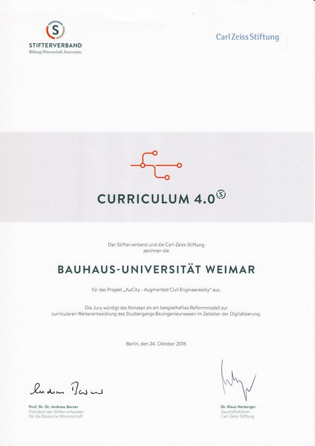 Hinter dem Projekt »Augmented Civil Engineereality« (AuCity) stehen das Bauhaus-Institut für zukunftsweisende Infrastruktursysteme (b.is) mit Prof. Jörg Londong, Dr.-Ing. Christian Springer und Dr.-Ing. Heinrich Söbke, sowie das elearning Labor (eLab) der Bauhaus-Universität Weimar mit Jun.-Prof. Steffi Zander. Mit der App-Idee möchte das Wissenschaftler-Team zukünftig das Curriculum für die Studiengänge Bauingenieurwesen und Umweltwissenschaften durch innovative Lehrkonzepte bereichern.