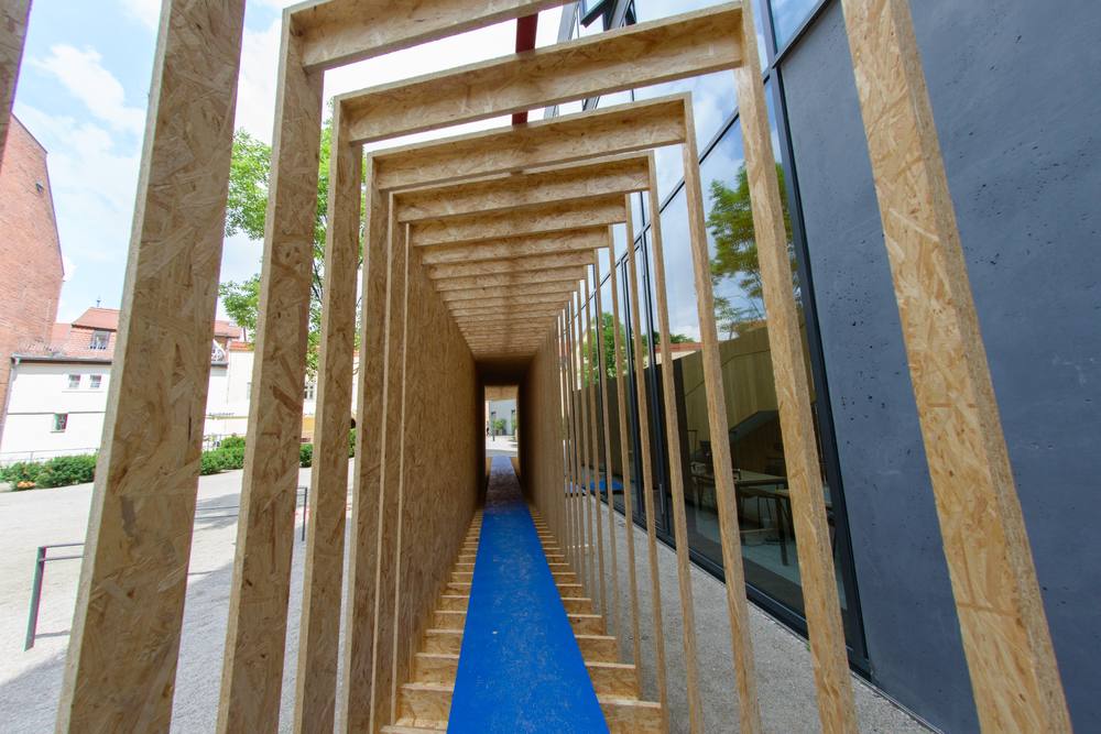 Die prämierte Arbeit nimmt Bezug auf das internationale Studienprogramm International MediaArchitecture Master Studies (IMAMS), in dessen Rahmen es entstanden ist. »Doppelgänger« stellt als Kommunikations- und Begegnungsraum eine Verbindung sowohl zwischen den Studienstandorten Weimar und Buffalo (New York) als auch zwischen den Fachrichtungen Medien und Architektur her. Dies gelingt durch zwei Tunnelkonstruktionen aus 83 Holzrahmen von je 20 Metern Länge. Im Fußboden eingebaute Kontaktmikrophone nehmen Trittgeräusche der Besucherinnen und Besucher auf, welche in den jeweils anderen Tunnel übertragen und mithilfe von Lautsprechern wiedergegeben werden.