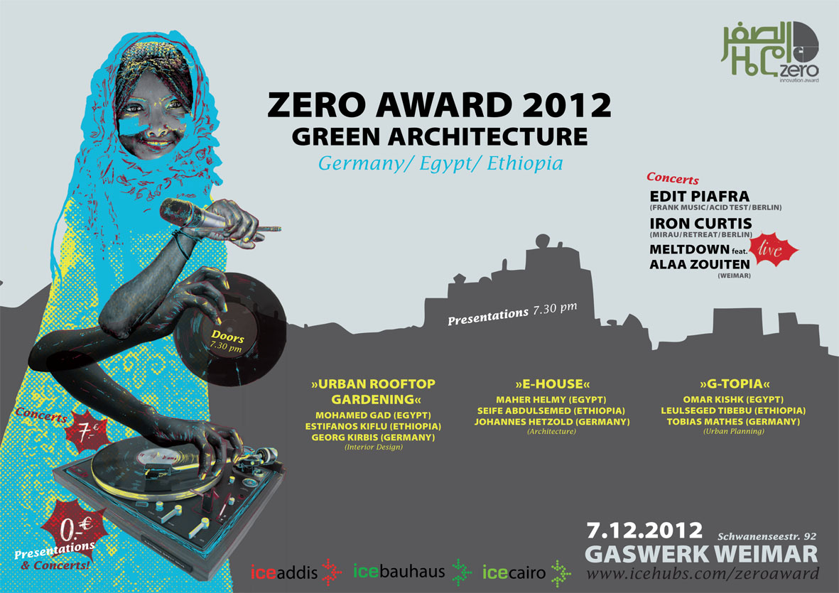 Der Wettbewerb, der seit Anfang des Jahres im »icehubs« Innovations-Netzwerk veranstaltet wird, möchte junge Innovatoren aus Ägypten, Äthiopien und Weimar fördern. Ziel ist es, alternative und nachhaltige Lösungen für aktuelle städtebauliche Herausforderungen in Afrika hervorzubringen. Im Juli 2011 begann Jörn Schultz im Auftrag der GIZ, einen neuen Netzwerkknoten für ganz Deutschland aufzubauen: das »icebauhaus«. Seitdem kooperieren Architekten und Gestalter der drei »hubs« in zahlreichen Projekten, eines davon ist der »Zero Award for Green Architecture 2012«.