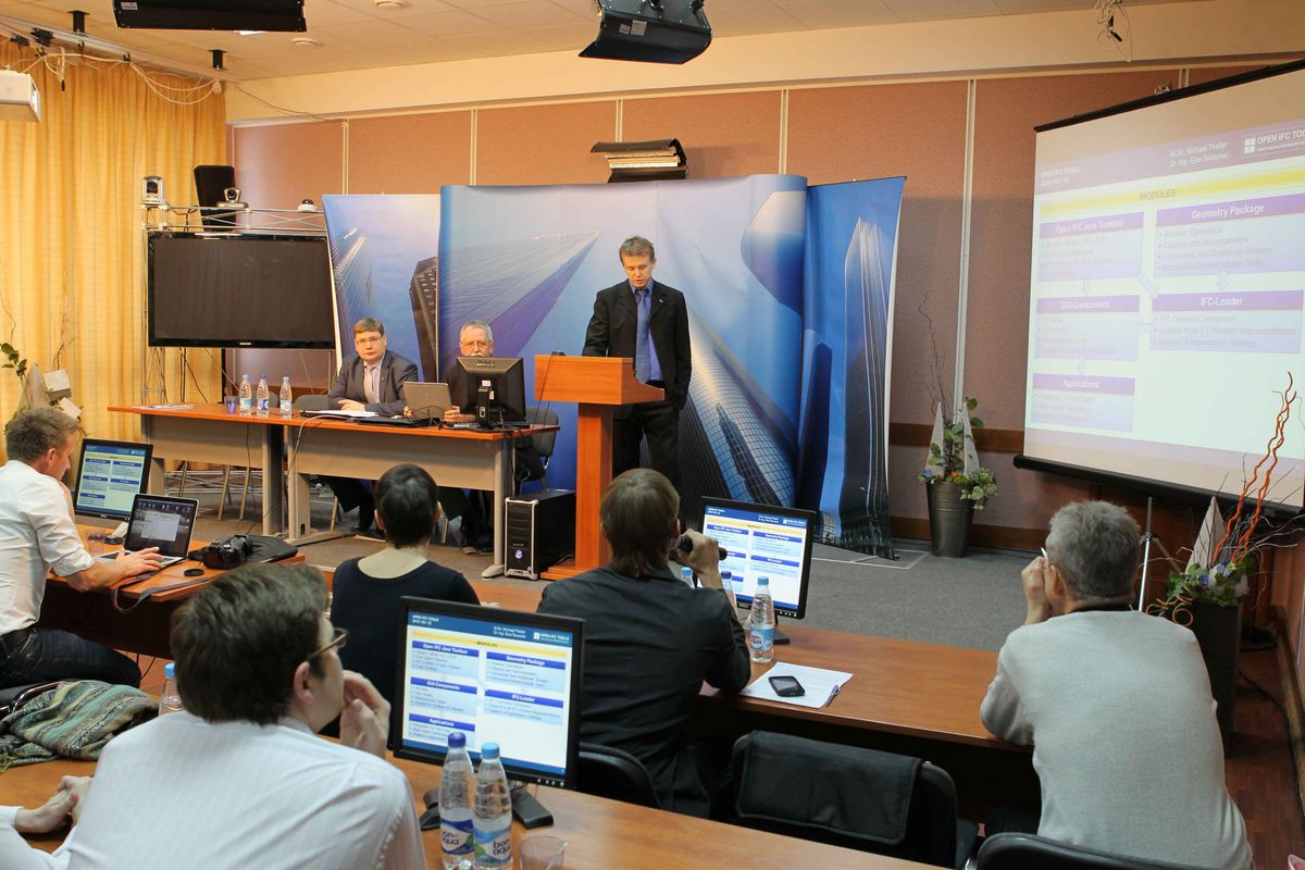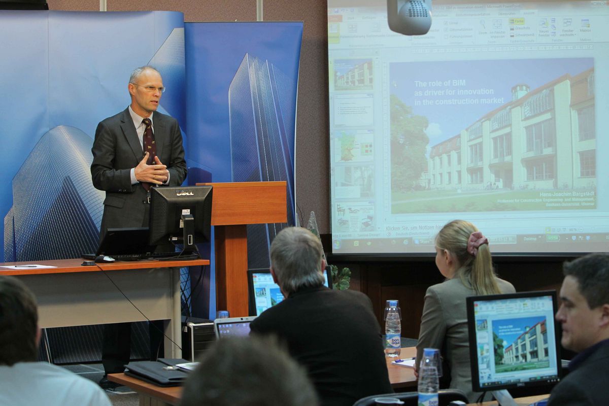 Von deutscher Seite wurden neun Vorträge gehalten. Nach der Begrüßung durch den Rektor Prof. V. Telichenko, den Prorektor Prof. A. Volkov, Herrn Rusakov vom DWIH Moskau und den Initiator Dr.-Ing. H. Kirschke von der Bauhaus-Universität in Weimar hielt Prof. Bargstädt, Bauhaus-Universität Weimar den Eröffnungsvortrag. Unter dem Titel „BIM als Innovationsträger für die Bauwirtschaft“ wurde den russischen Teilnehmern ein Überblick darüber vermittelt, welche Informationen und Prozesse im Bauwesen durch die Anwendung und Weiterentwicklung von (BIM) verändert, verbessert und vor allem für professionelles innovatives Handeln fit gemacht werden können.