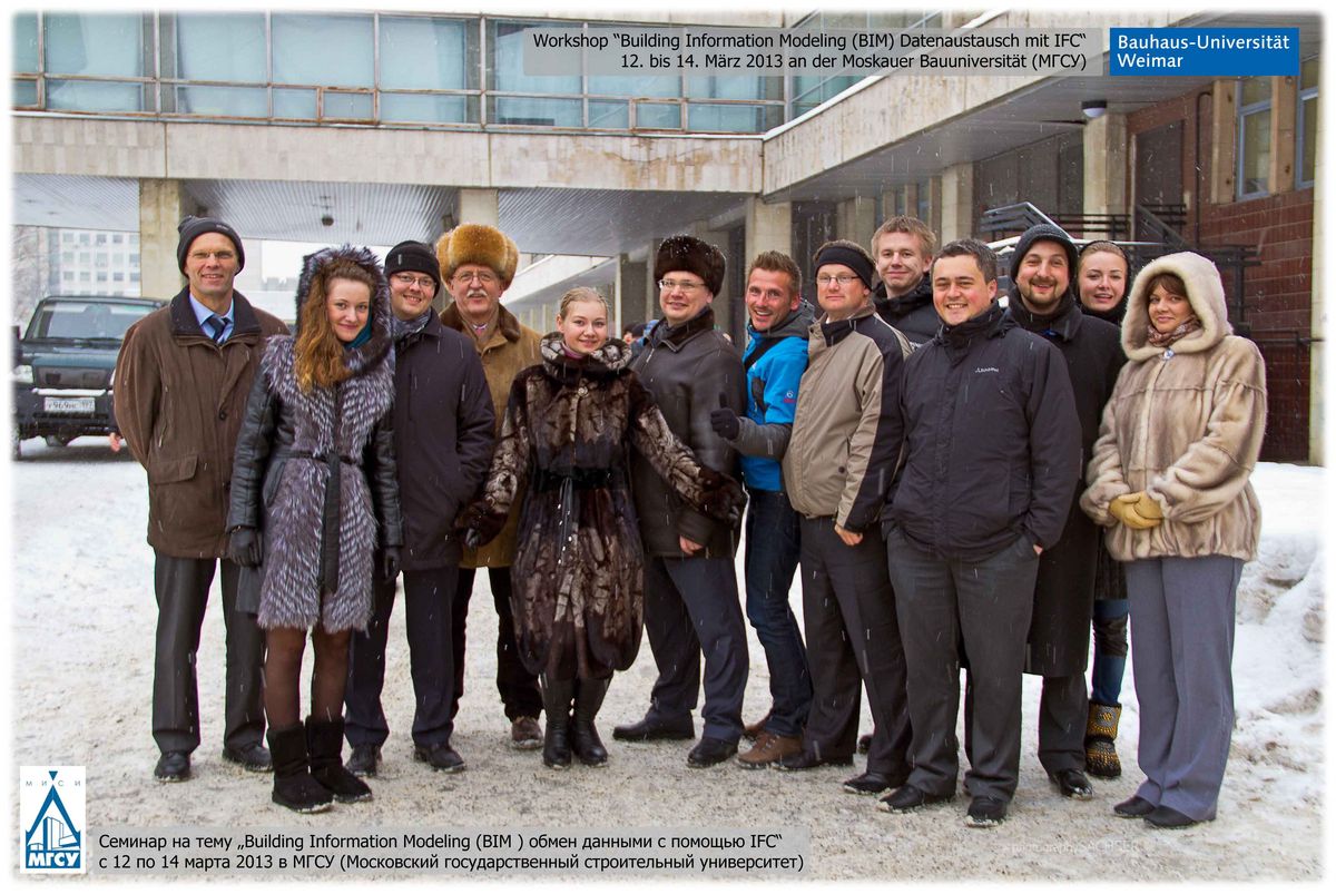 Mitte März fand an der Moskauer Bauuniversität (MGSU) der Workshop zum Thema „Building Information Modeling (BIM) – Datenaustausch mit IFC“ statt. Initiiert, organisiert und koordiniert wurde er von Dr.-Ing. Heiko Kirschke von der Professur Informatik im Bauwesen an der Fakultät Bauingenieurwesen der Bauhaus-Universität Weimar sowie von Prof. Dr.-Ing. habil. A. Volkov, Prorektor der MGSU für Wissenschaft und Lehrstuhlleiter des Lehrstuhls „Informationssysteme, Technologie und Automatisierung im Bauwesen“ am Institut für Ökonomie, Bauleitung und Informationssysteme und von Prof. E. Gogina, Dekanin der Fakultät „Ökologisches Bauen und Mechanisierung“.