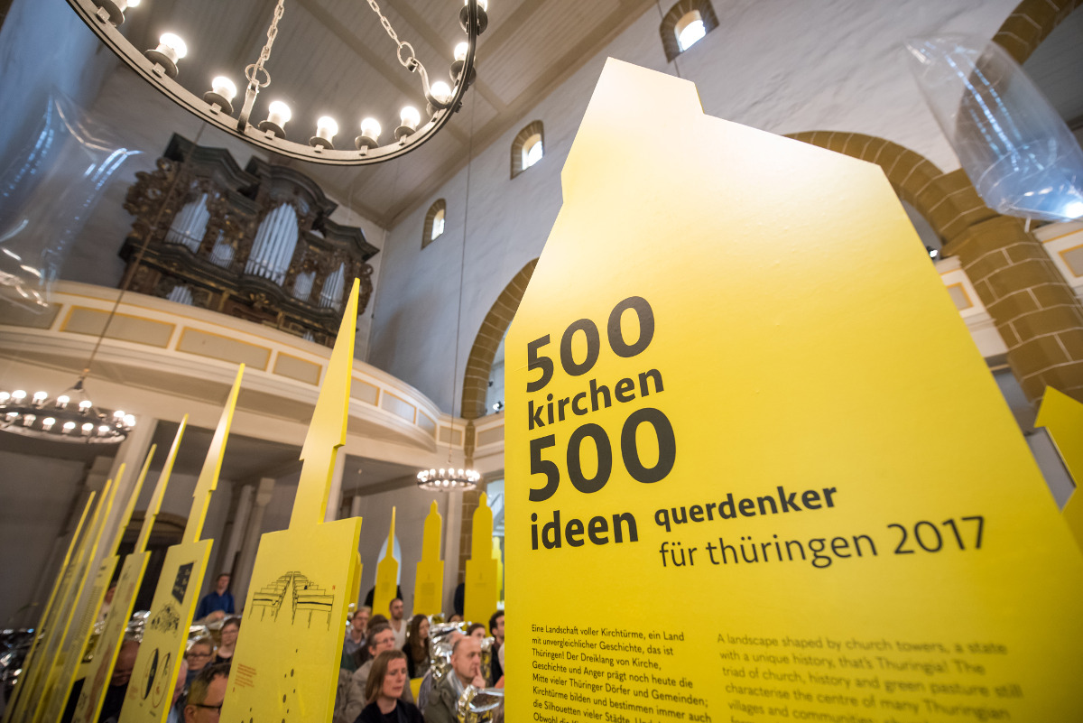 Die Ausstellung »500 Kirchen 500 Ideen« in der Erfurter Kaufmannskirche kann noch bis zum 19. November 2017 besucht werden. Täglich von 11 bis 18 Uhr gibt es Kurz-Videos zu sehen mit Ideen, wie sich die Zukunft der Thüringer Kirchen gestalten lässt. Auch zahlreiche Studierende der Bauhaus-Universität Weimar hatten ihre Ideen eingereicht.